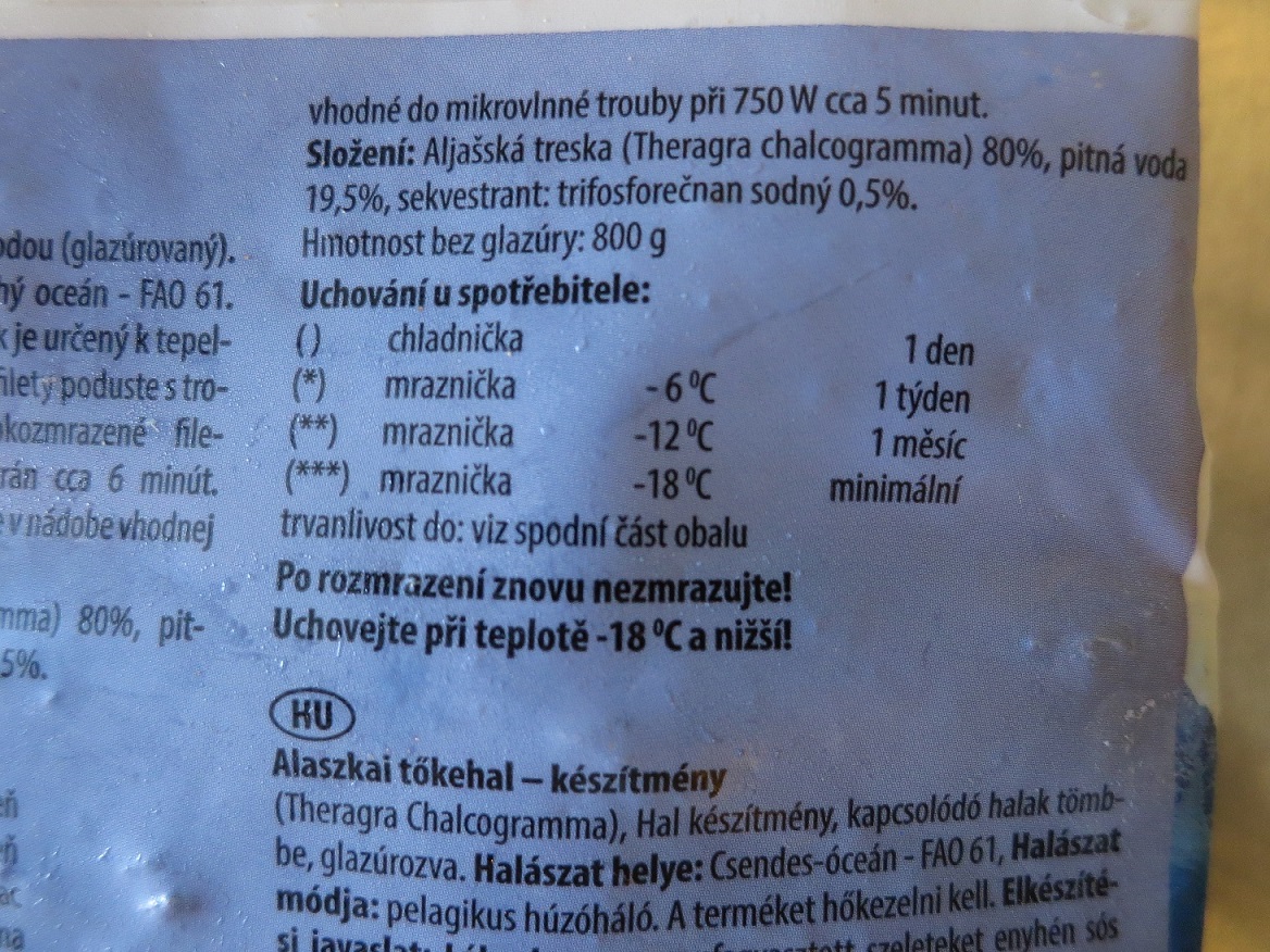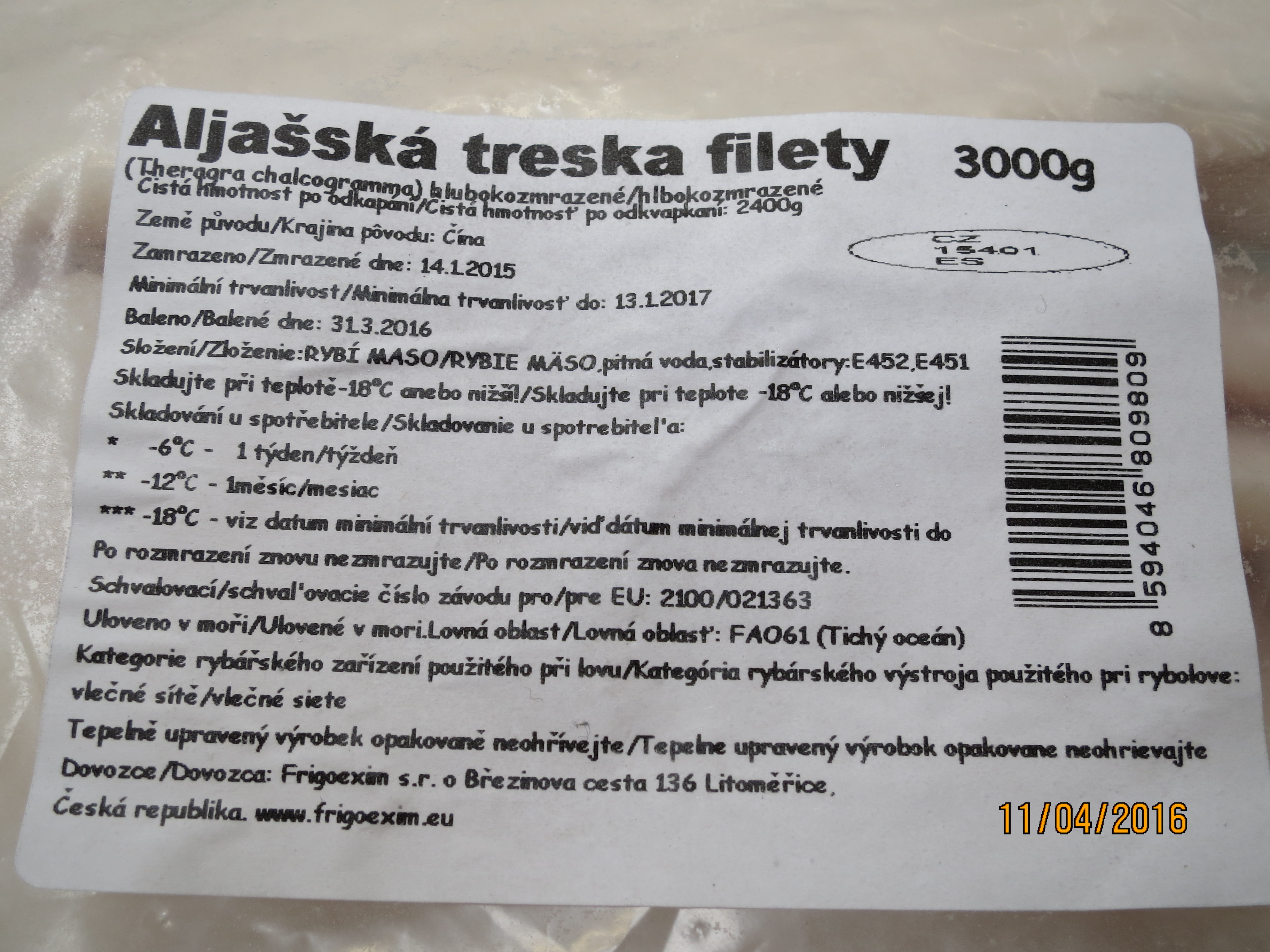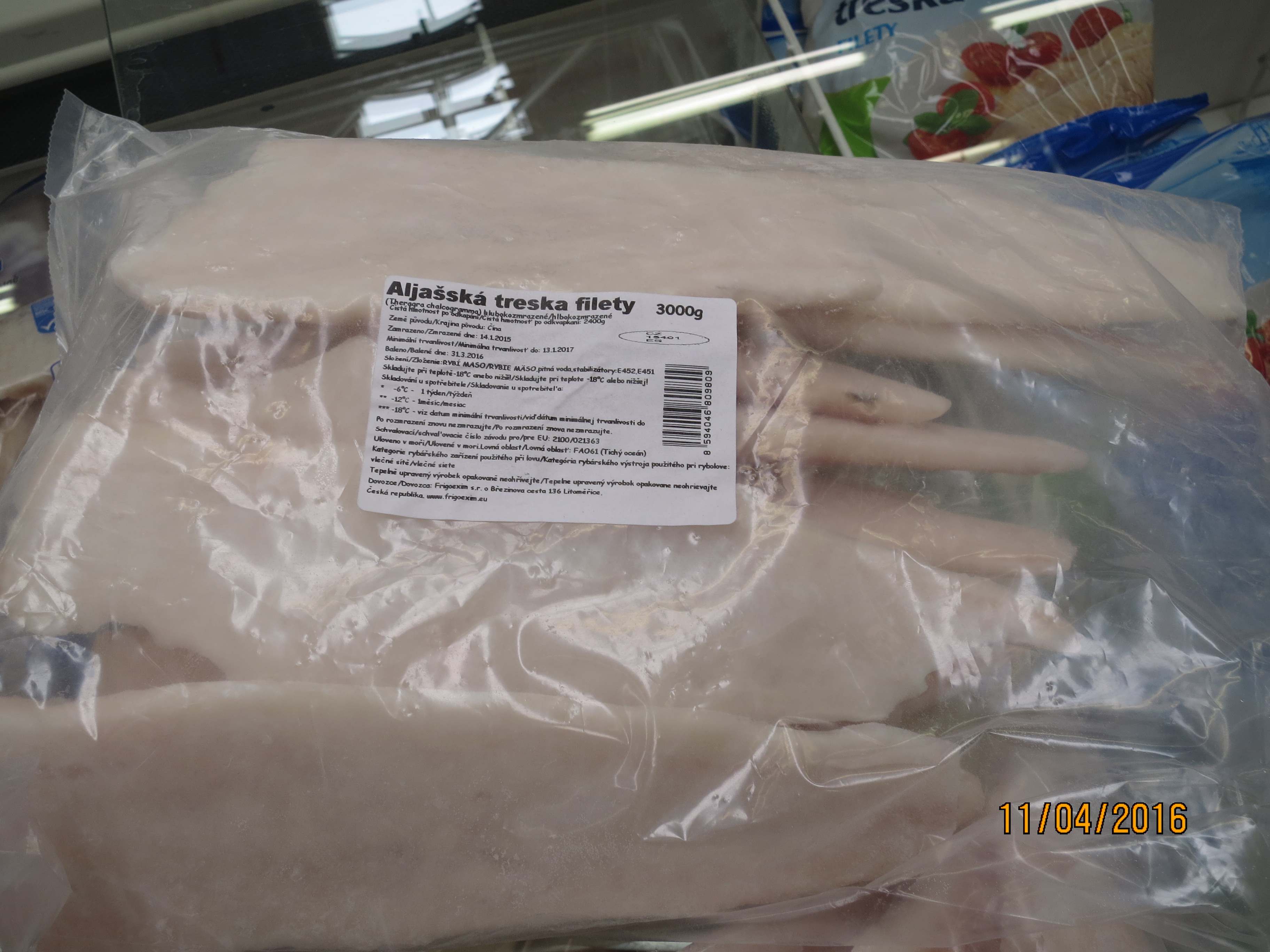 Aljašská treska filety v balení 3000 g, s označením data minimální trvanlivosti do 13. 1. 2017, země původu: Čína, dovozce: Frigoexim s.r.o. Březinova cesta 136 Litoměřice, ČR. Výrobce na obalu uvedl: „hmotnost 3000 g, … čistá hmotnost po odkapání 2400g“ (tj. obsah masa 80%), laboratorní rozbor potvrdil obsah masa pouze v hodnotě 46,7%. Inspektoři SZPI nevyhovující vzorek odebrali v provozovně společnosti MAKRO Cash & Carry ČR s.r.o. a provozovateli nařídili neprodleně stáhnout závadnou šarži ze své tržní sítě.