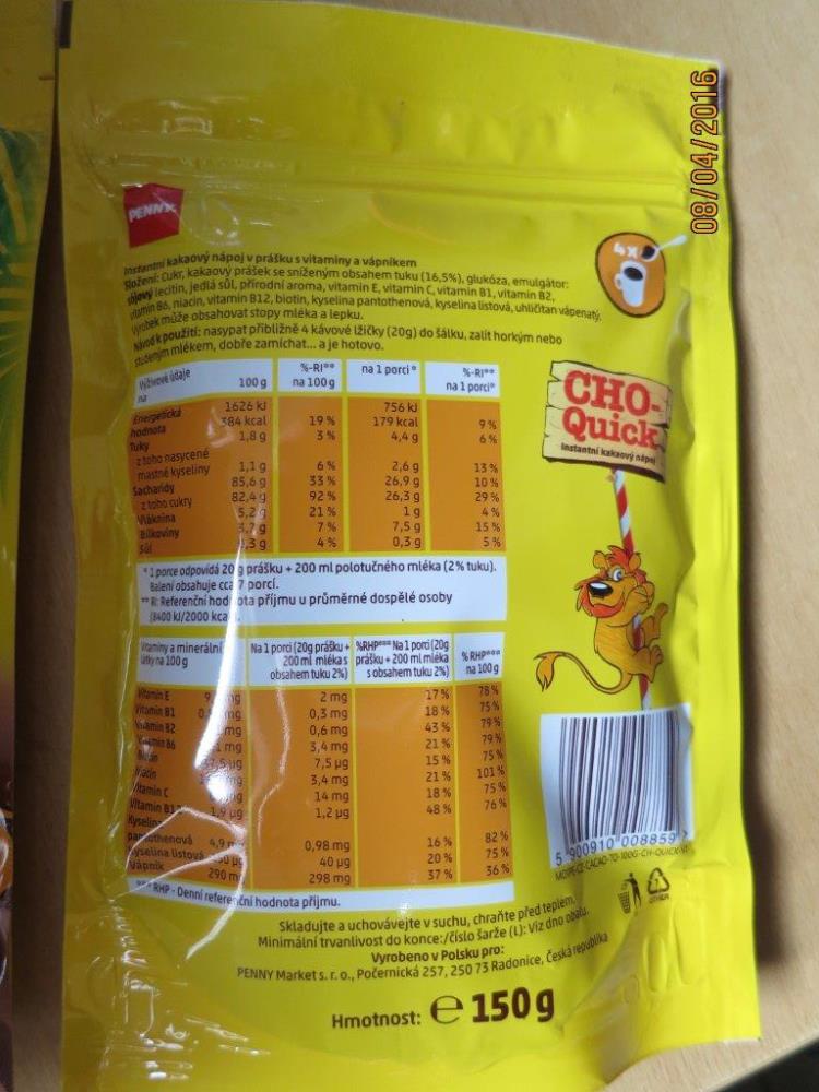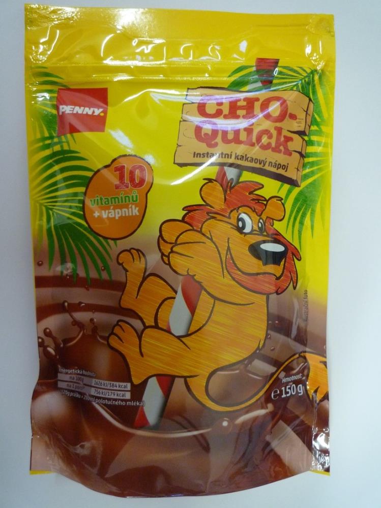 PENNY CHO Quick, Instantní kakaový nápoj 10 vitamínů+vápník v balení 150 g a s označením data minimální trvanlivosti do 04/2017, vyrobeno v Polsku pro: PENNY Market s.r.o. Výrobce na obalu ve složení mj. uvedl: vitamín B2 – 1,1 miligramů (mg) na 100 g. Laboratorní rozbor SZPI ale potvrdil přítomnost vitamínu B2 pouze v hodnotě 0,53 mg na 100 g a informace na výrobku tak uváděla spotřebitele v omyl. Dále laboratorní analýza v předmětné šarži potraviny zjistila přítomnost alergenu mléčná bílkovina v koncentraci 2 764 mg/kg, přičemž výrobce na obalu deklaroval pouze stopy mléka.