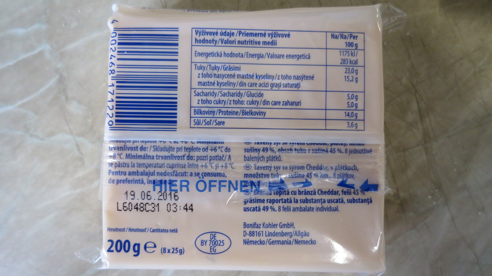 Cheesy Singles with Cheddar, 200 g, Tavený sýr se sýrem Cheddar s označením data minimální trvanlivosti do 19. 06. 2016, šarže L6048C31, výrobce Bonifaz Kohler GmbH D-88161 Lindenberg, Německo. Analýza prokázala pochybení u obsahu mléčné sušiny, které bylo naměřeno 47,27% oproti uváděným 49%. Spotřebitel tak byl uveden v omyl tvrzením na etiketě. Výrobek se nacházel v distribuci společnosti BILLA, spol. s. r. o.